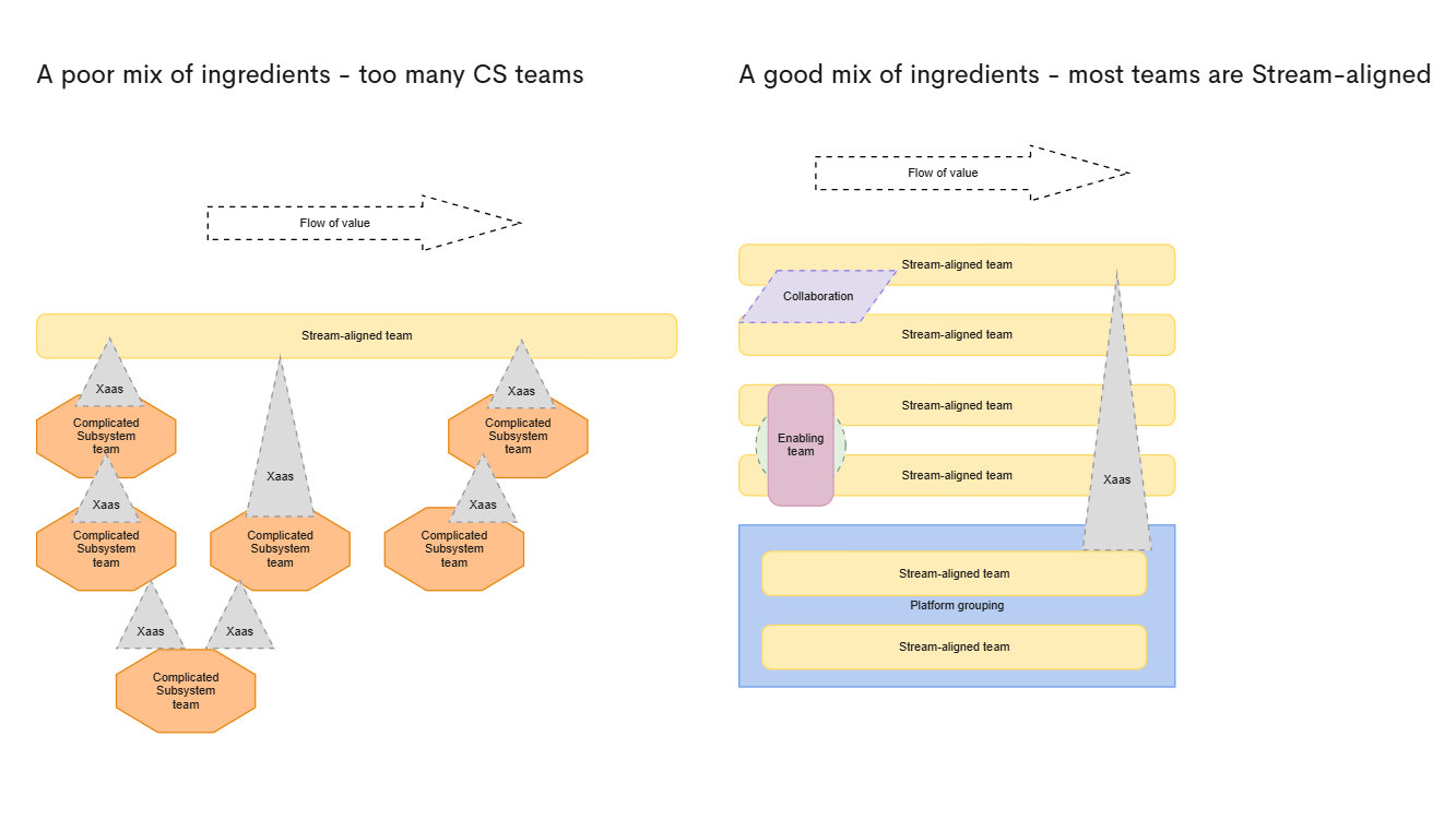 Our organizations are made up of the Team Topologies types identified by Matthew and Manuel. All are important and ensure that we provide value to the customer in some way, but without the right balance, the dish is all wrong. Too few Stream-aligned teams and we begin to question the cost to value ratio for our development organization. Too few platform teams and we have so much pressure on other key teams that they stand out in all the wrong ways, too much cognitive load and not enough value.