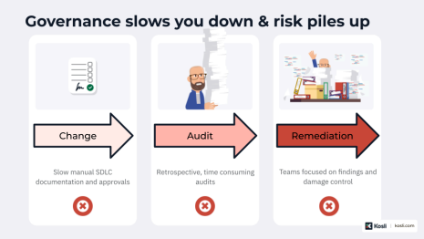 This is the conflict playing out in large banks today - software delivery is increasingly automated and fast, but governance is still manual and slow. Developers can ship changes quickly, but those changes run into a wall of bureaucracy before they can be delivered to customers.